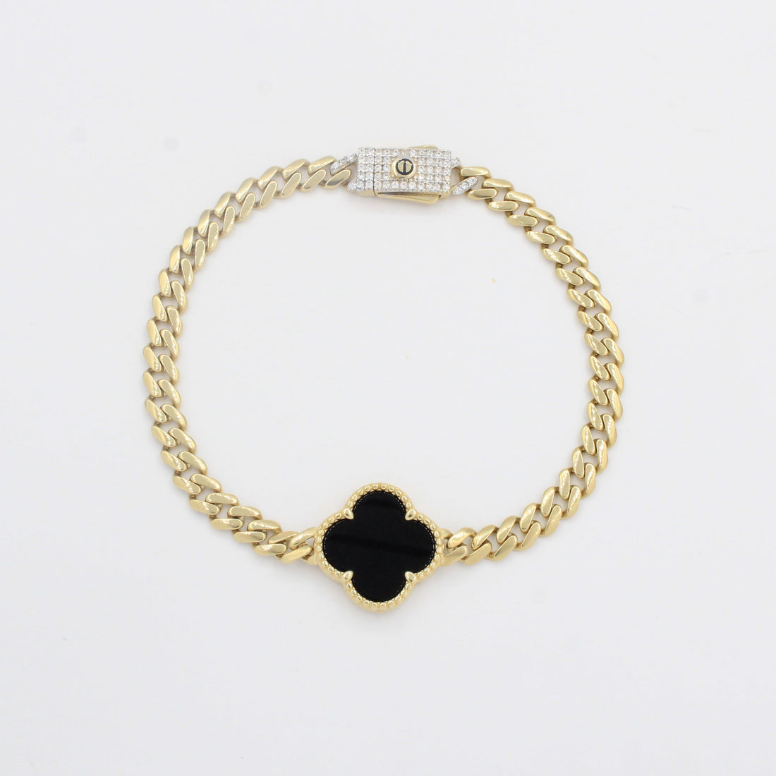 Pulsera de Oro 14k Tejido Barbado Hueco con Trébol de Onix y Zirconias Finas mod. 10304
