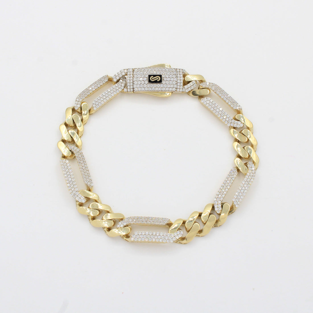 Pulsera Monaco Chain de Oro 14k Hueco Modelo Figaro 3x1 Alt Pavé Swarovski mod. 10329