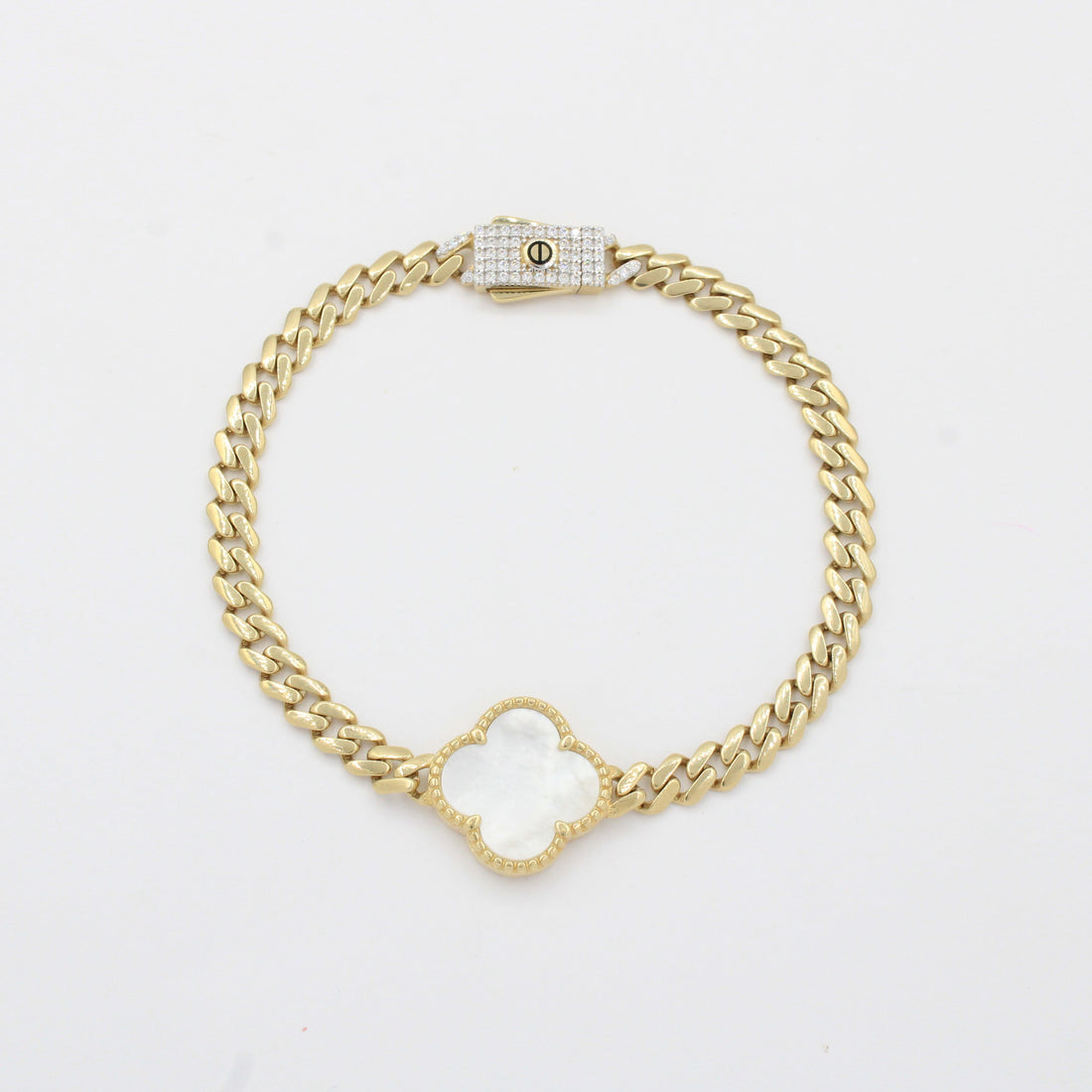 Pulsera de Oro 14k Tejido Barbado Hueo con Trébol de Madre Perla y Broche con Zirconias mod. 10333