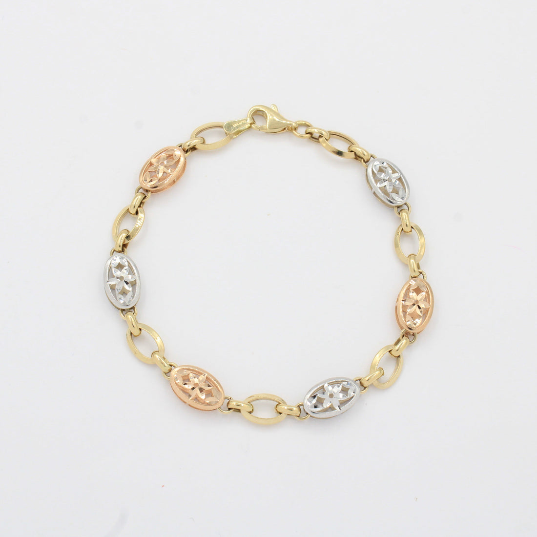Pulsera de Oro 14k Tejido Especial de Eslabones Huecos y Brillantes Enlazados con Cadena Fina y Brillante mod. 10334