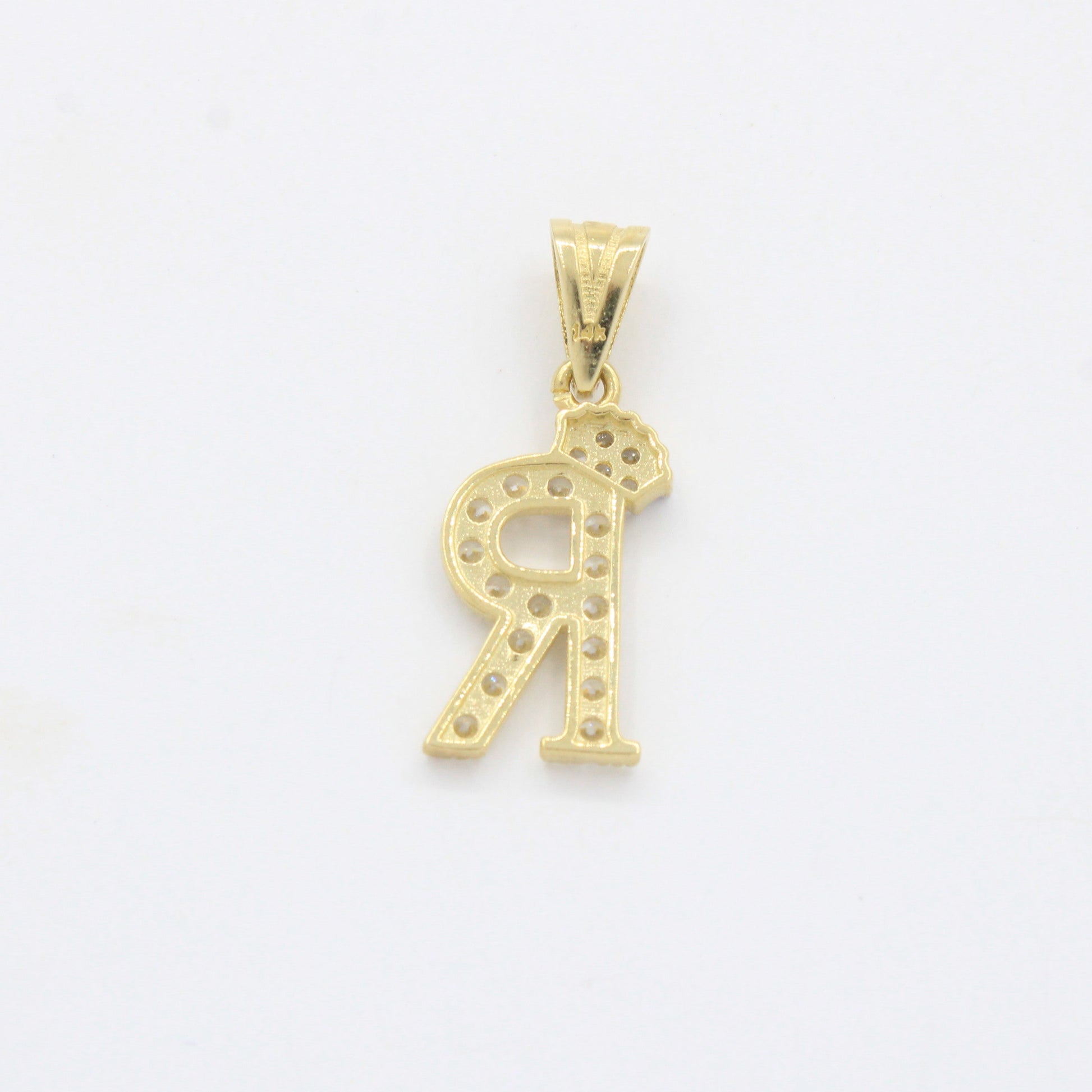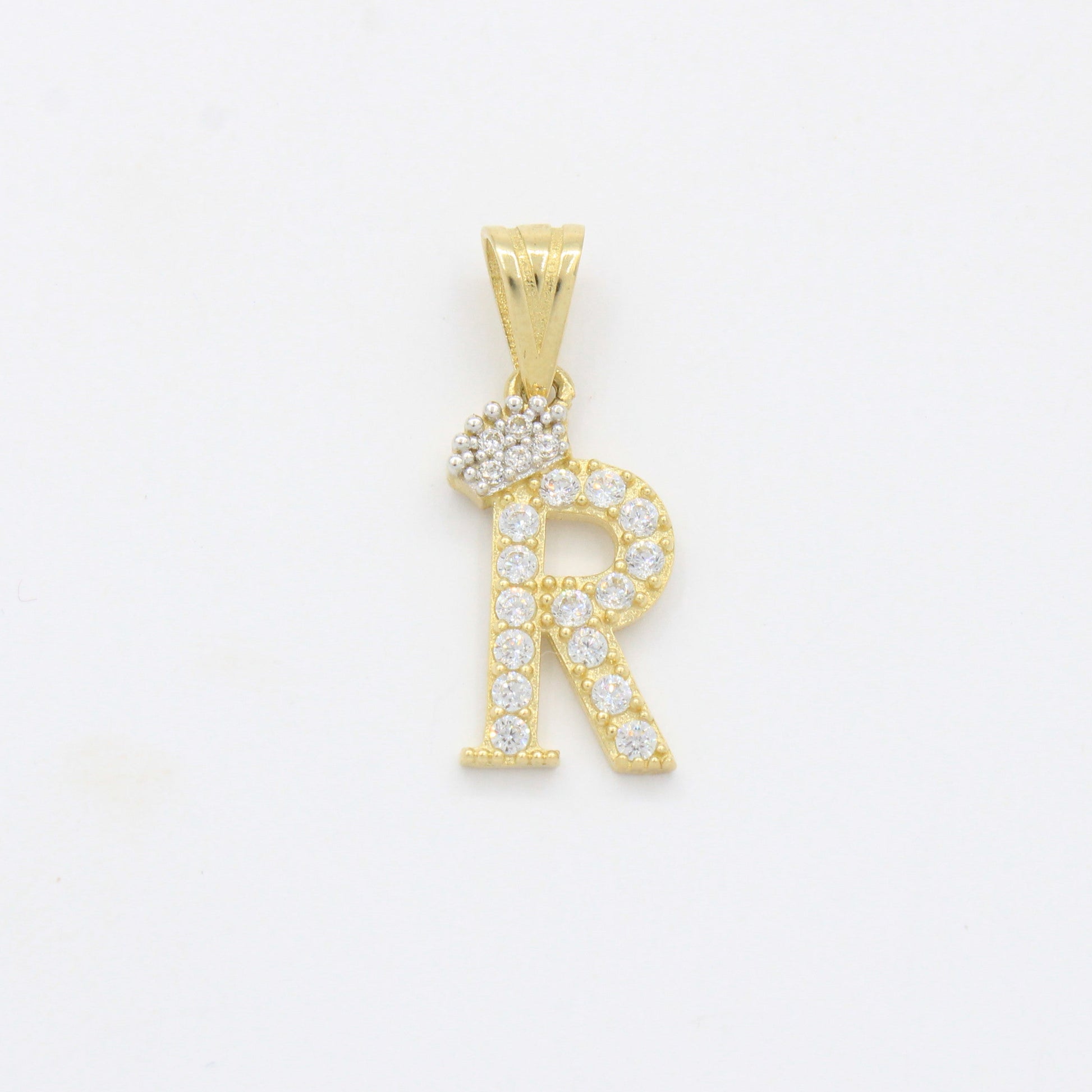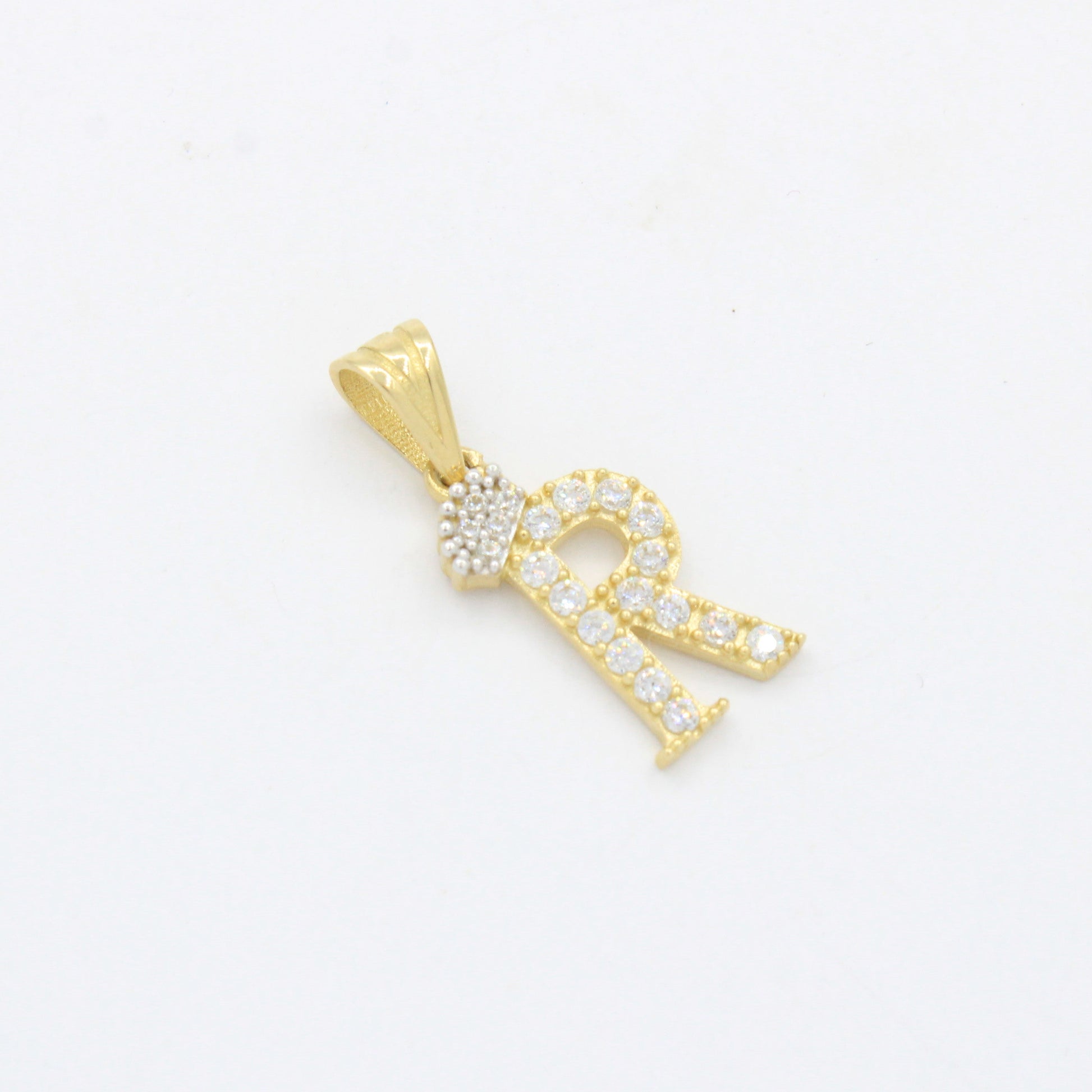 Dije de Oro 14k Modelo de Inicial R Diseñado con Corona e Incrustación de Zirconias mod. 10572
