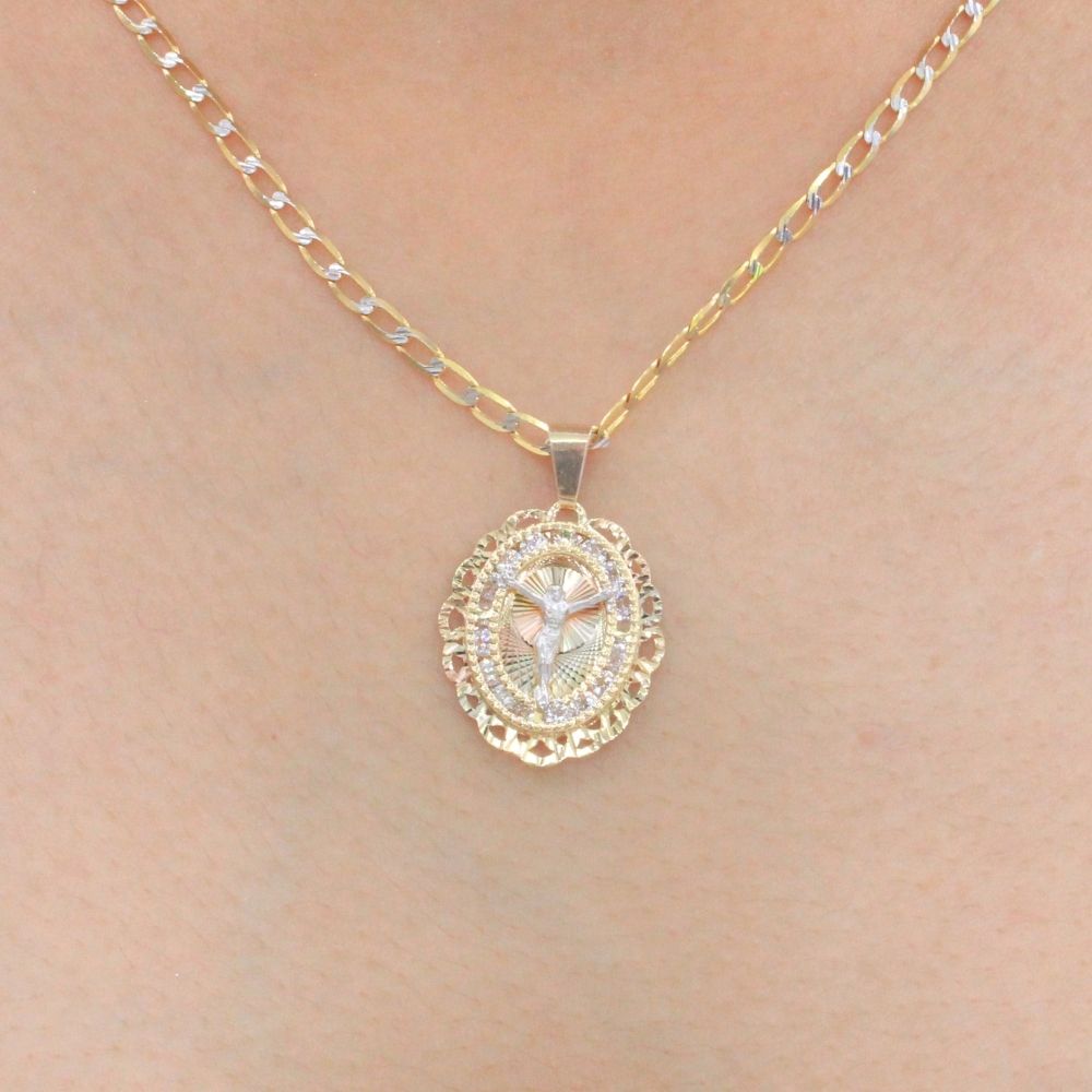 Medalla de Oro 14k para Bautizo con Cristo en Cruz y Marco Calado con Zirconias Mod. 9890