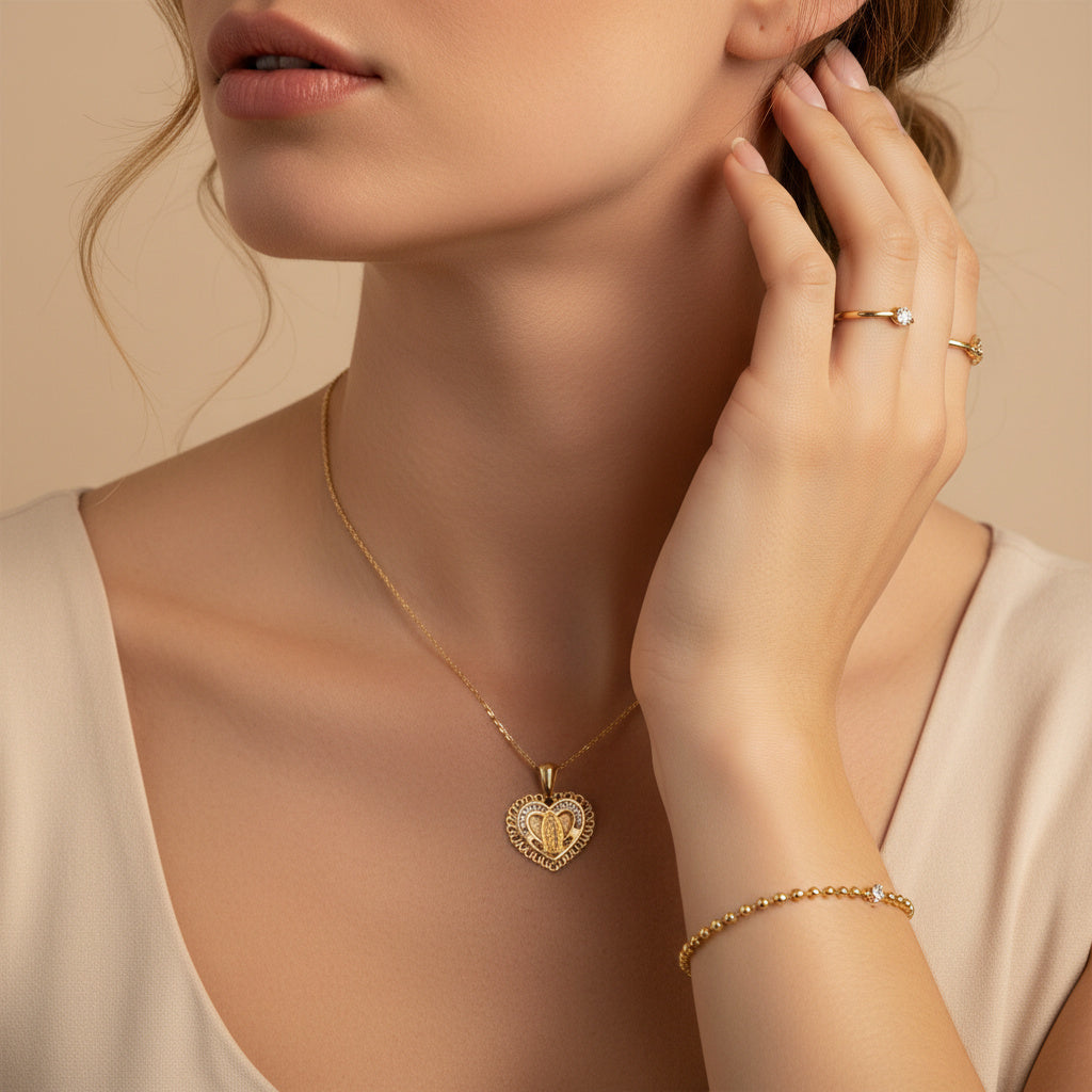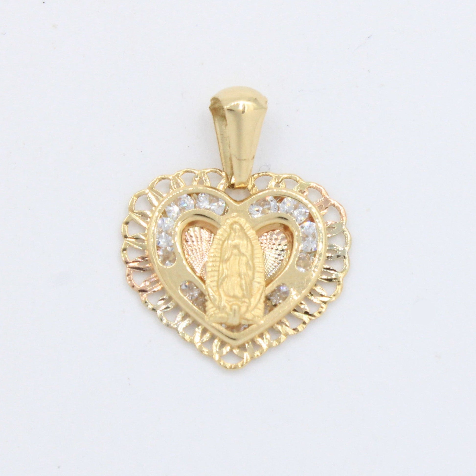 Medalla de oro 14k Virgen de Guadalupe Diseño de Corazón con Incrustado de Zirconias mod. 10179