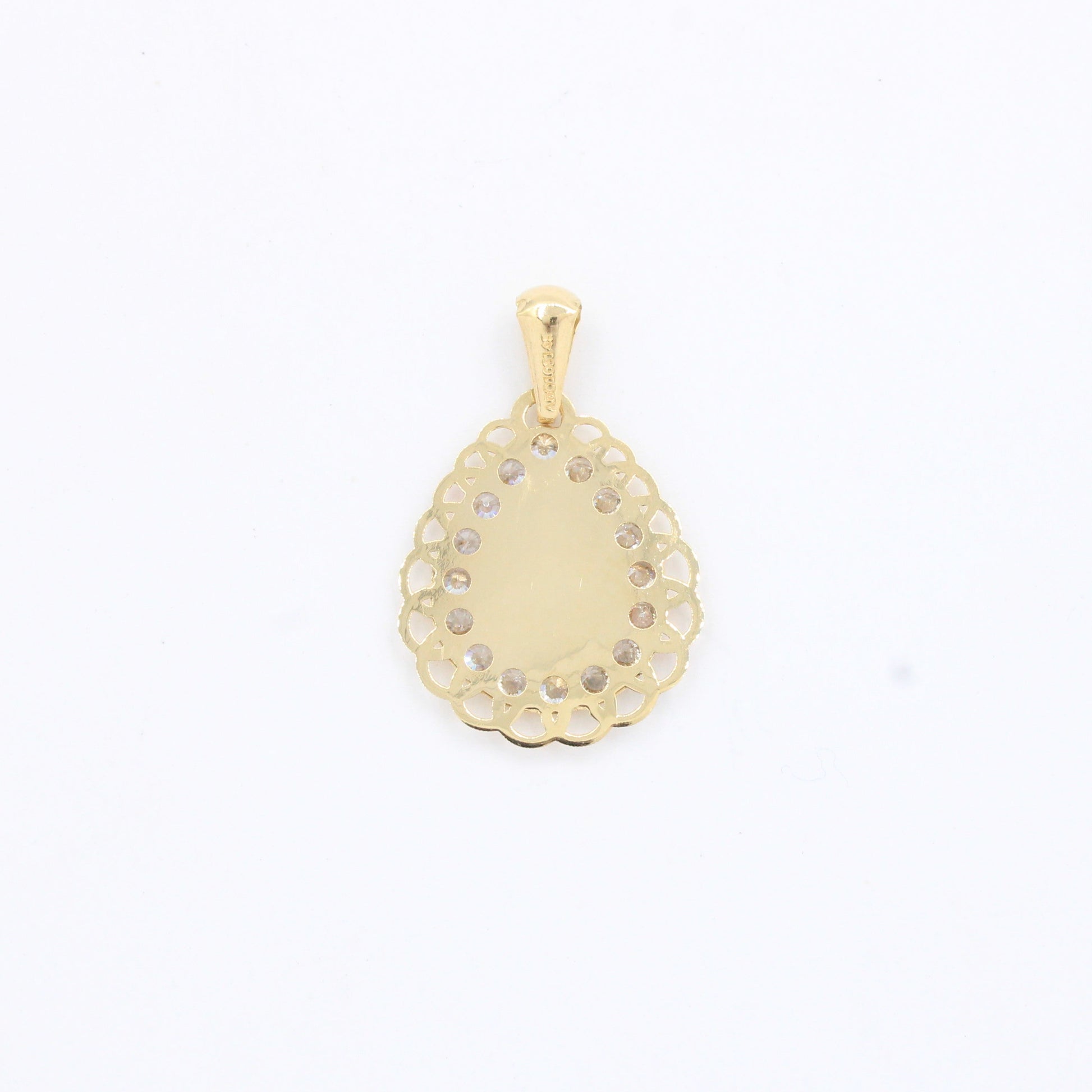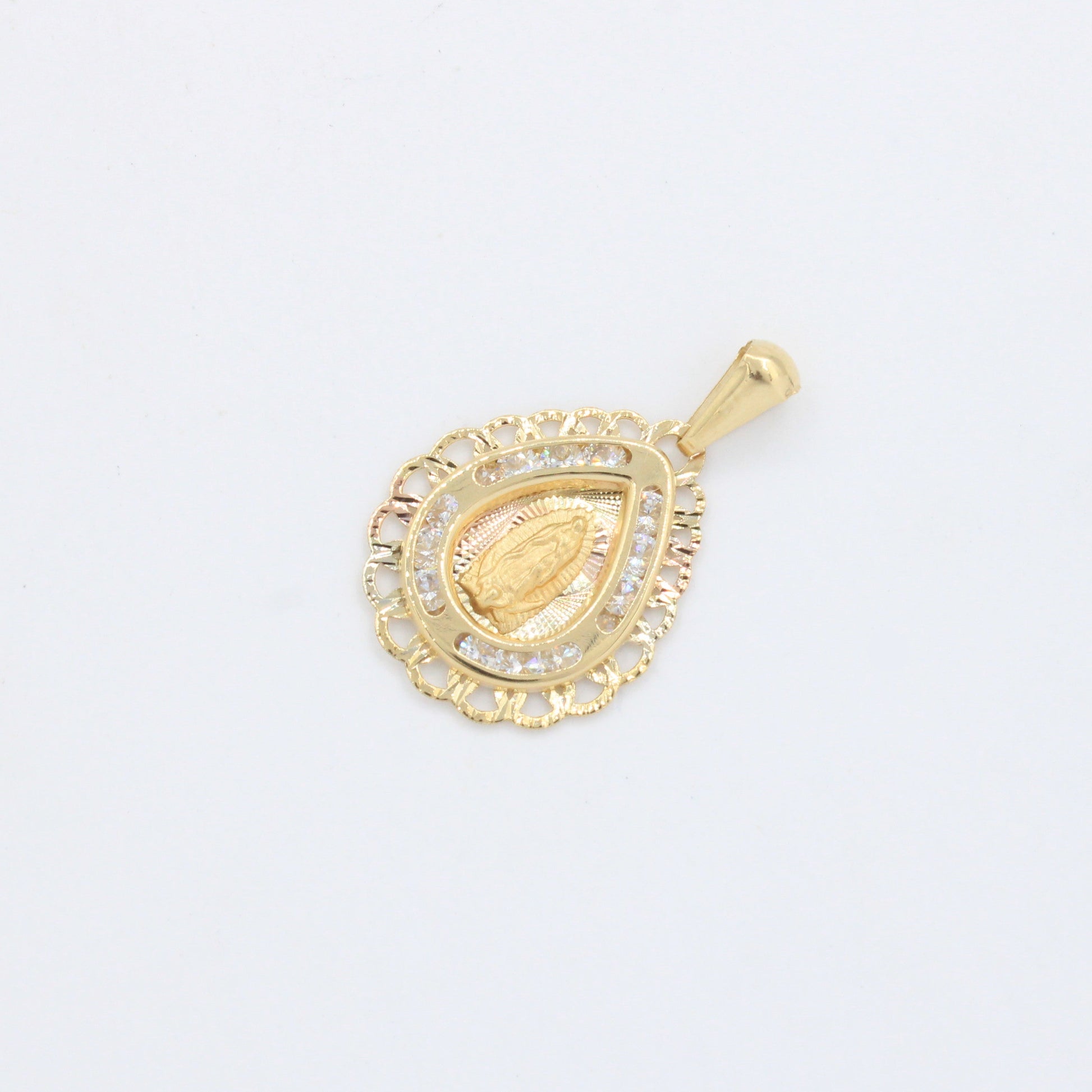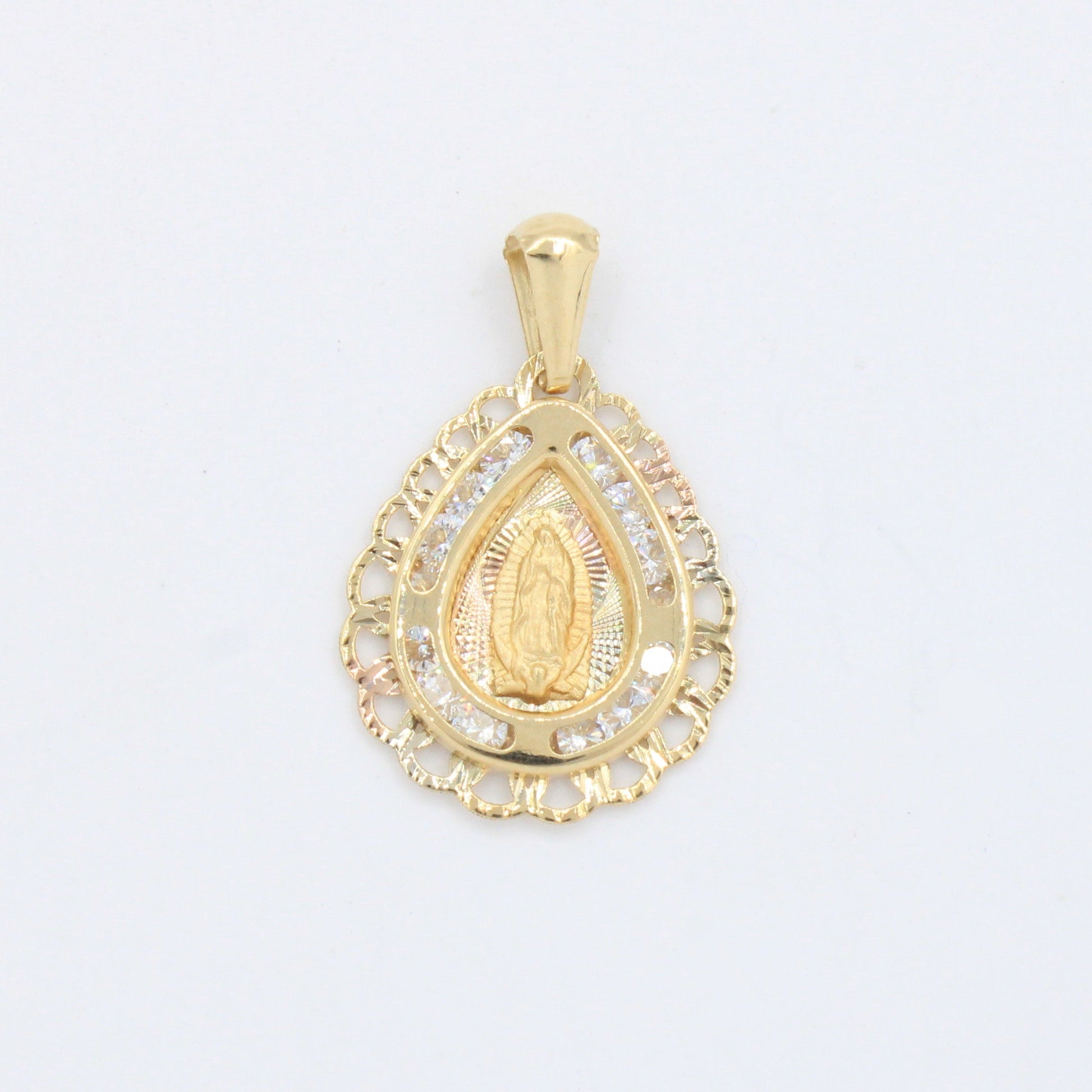 Medalla de oro 14k Virgen de Guadalupe Diseño de Gota con Incrustado de Zirconias mod. 10183