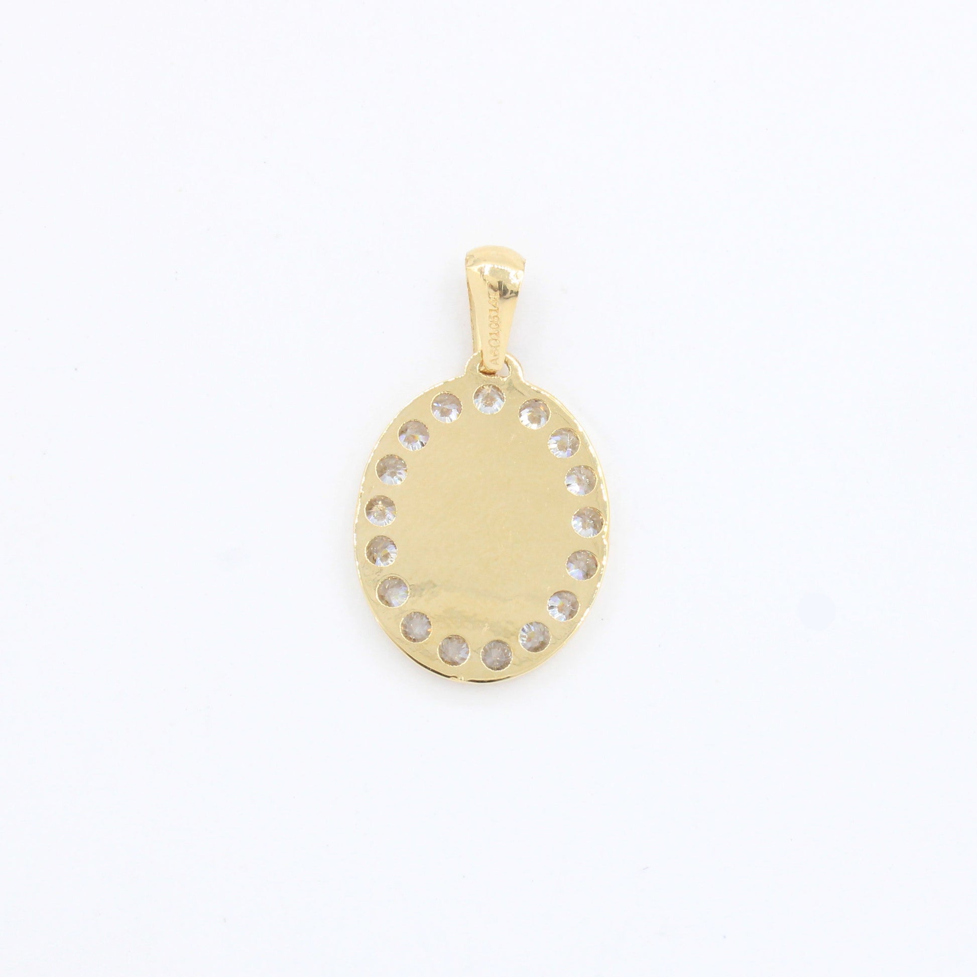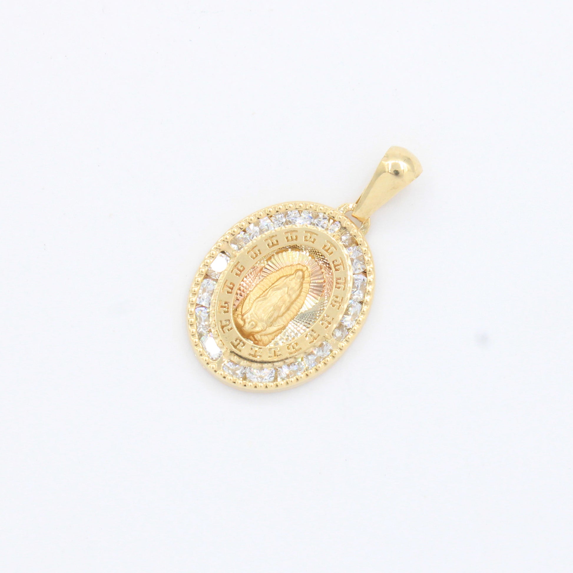 Medalla de oro 14k Virgen de Guadalupe Diseño Oval con Marco de Zirconias y Detalle de Greca mod. 10185