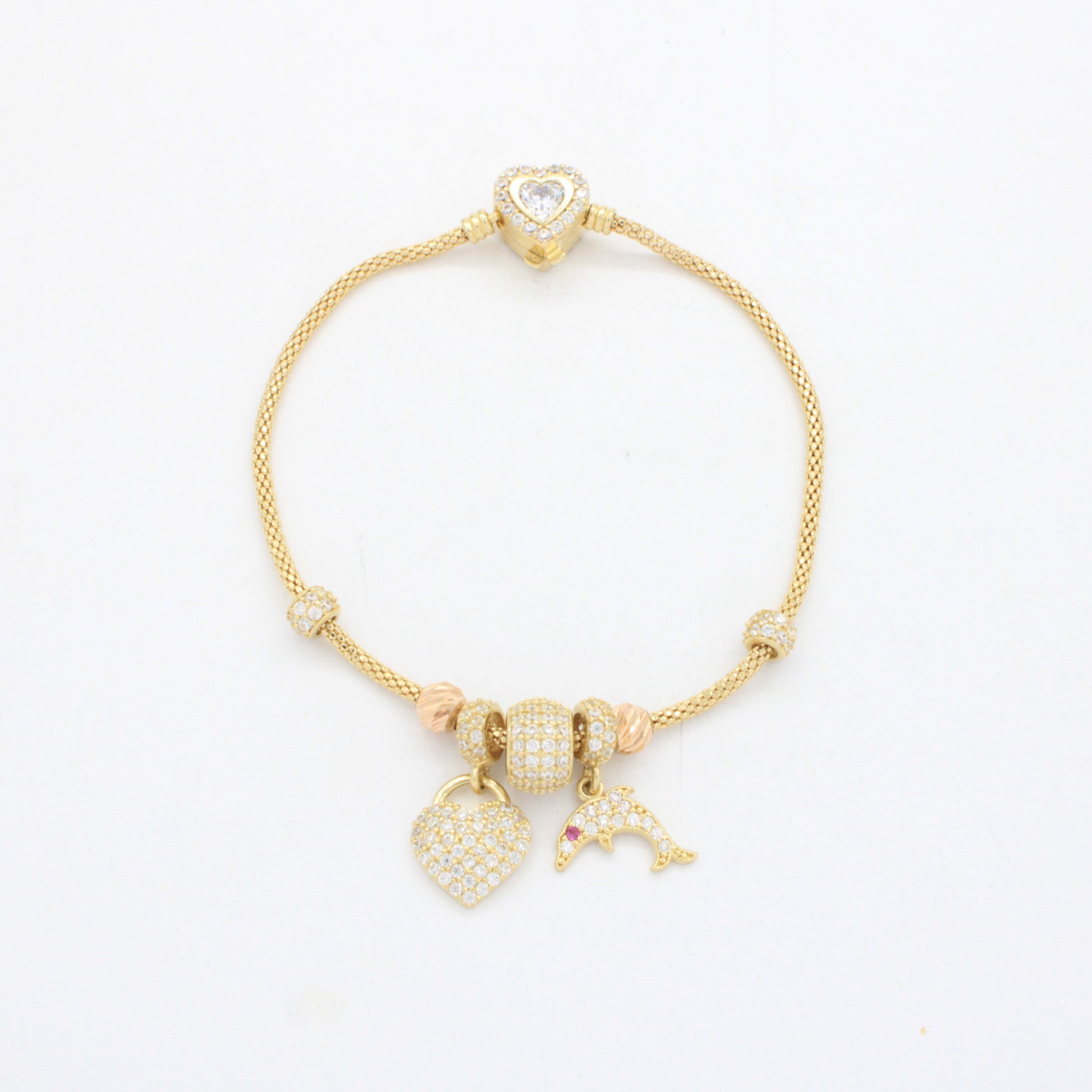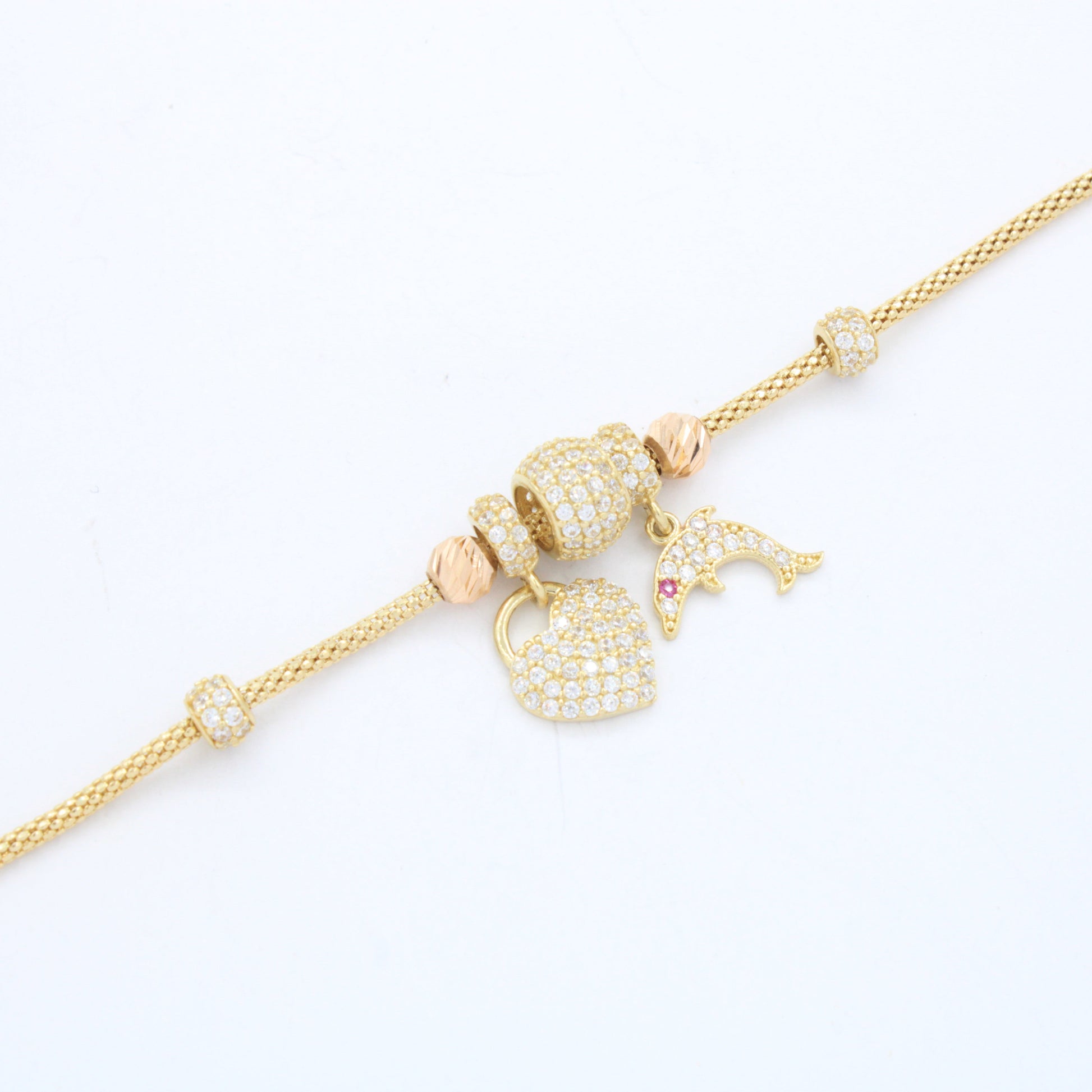 Pulsera de Oro 14k Tejido Cola de Rata con Dijes Charm, Detalles Finos y Diamantados con Zirconias mod. 10659
