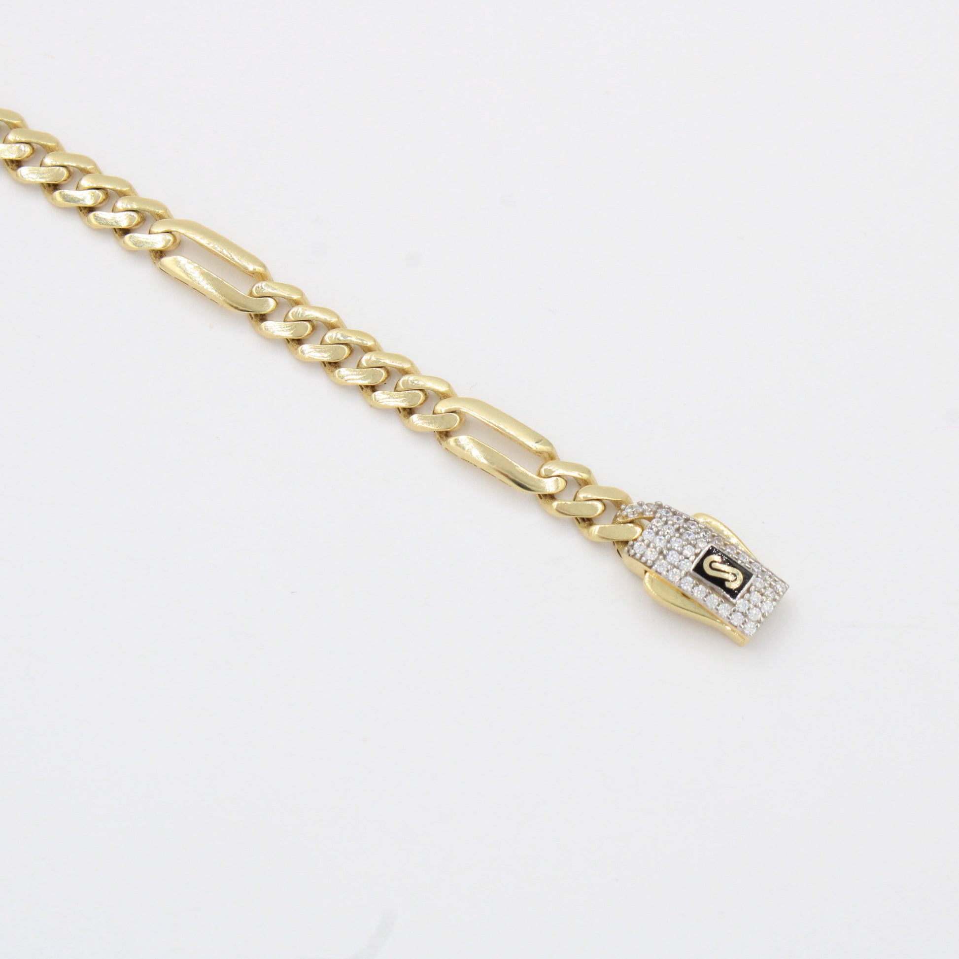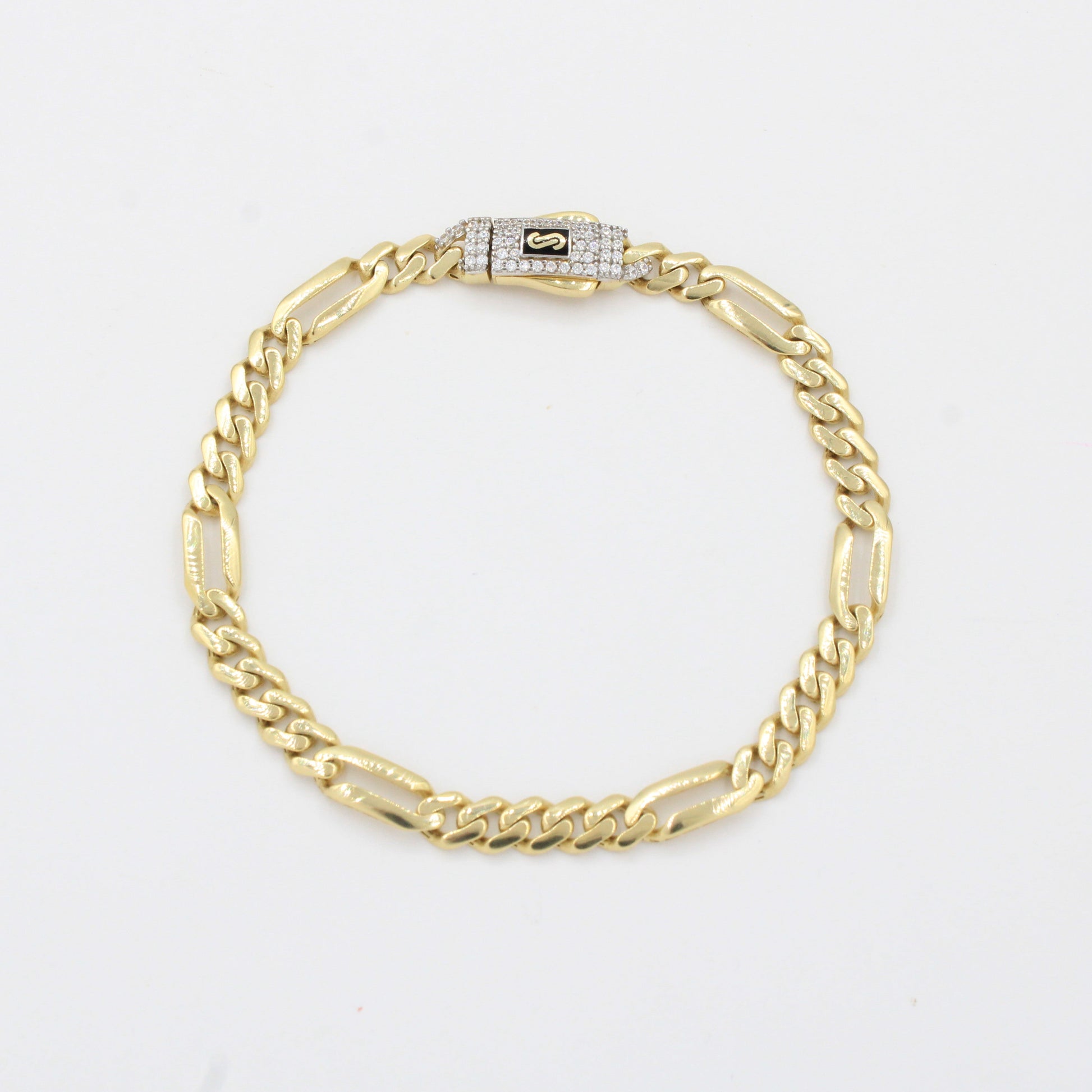 Pulsera Monaco Chain de Oro 14k Hueco Modelo Figaro 5x1 con Broche Pavé Swarovski mod. 10327